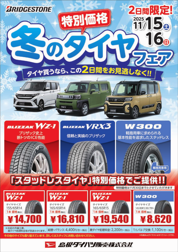 島根ダイハツでは、11月15日(土) 16(日) の2日間「冬のタイヤフェア」を開催いたします。