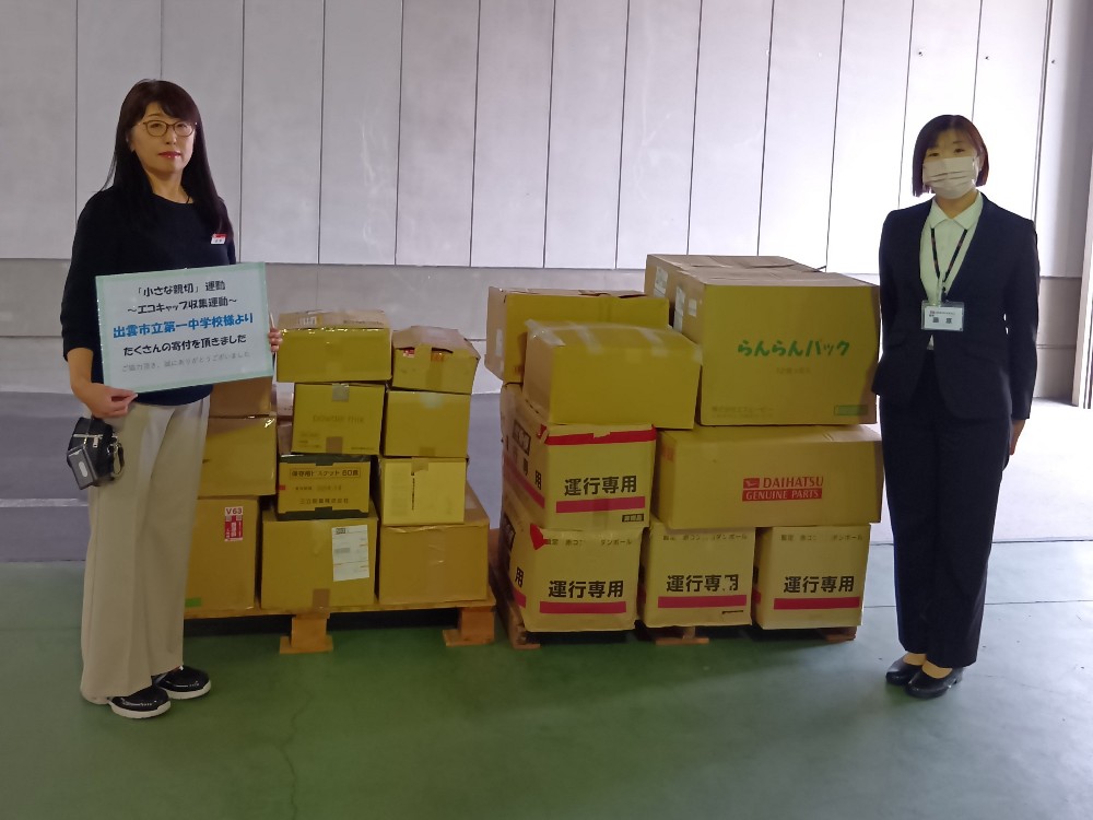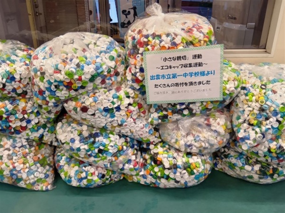このエコキャップ活動に「出雲市立第一中学校様」より約14袋分(約131kg)の寄付がございました!