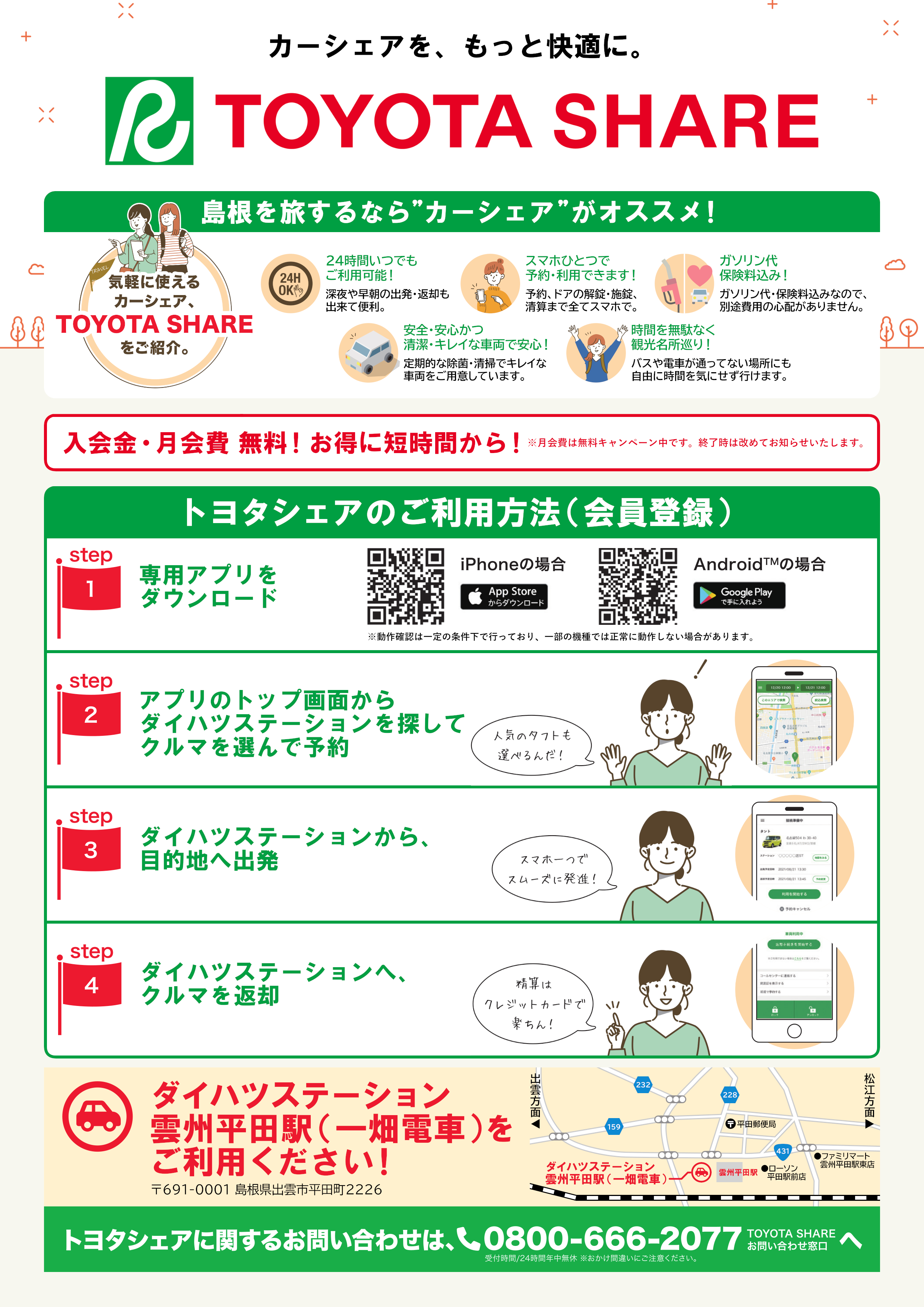 この度、より皆様に便利にご利用頂ける環境が整いましたので、出雲平田地区周遊観光など、ぜひお気軽にご利用ください。