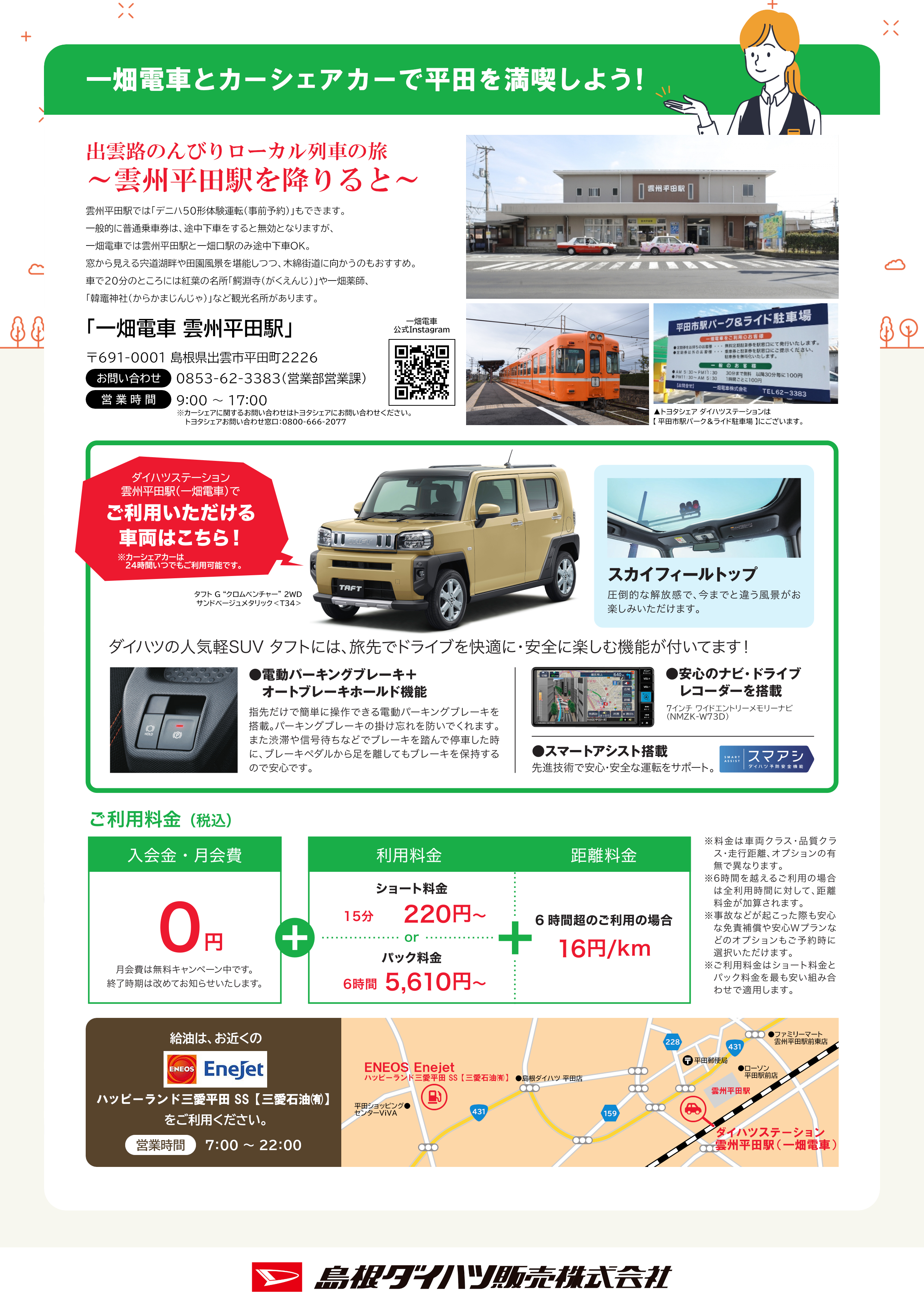 この度、島根ダイハツ販売(株)は一畑電車(株)と共同で、一畑電車 雲州平田駅パークアンドライド駐車場にカーシェアリング車両を設置し、